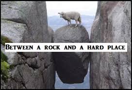 “Between a rock and a hard place” means being in a very difficult, stressful, or impossible situation where you must choose between two equally unpleasant, undesirable, or risky options. It describes a dilemma with no easy solution, often referred to as “the lesser of two evils”.