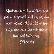 When Mordecai learned of all that had been done, he tore his clothes, put on sackcloth and ashes, and went out into the city, wailing loudly and bitterly.2 But he went only as far as the king’s gate, because no one clothed in sackcloth was allowed to enter it. 3 In every province to which the edict and order of the king came, there was great mourning among the Jews, with fasting, weeping and wailing. Many lay in sackcloth and ashes.