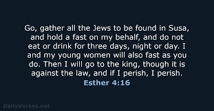 15 Then Esther sent this reply to Mordecai: 16 “Go, gather together all the Jews who are in Susa, and fast for me. Do not eat or drink for three days, night or day. I and my attendants will fast as you do. When this is done, I will go to the king, even though it is against the law. And if I perish, I perish.”