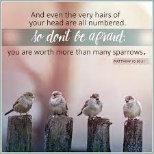 “So do not be afraid of them, for there is nothing concealed that will not be disclosed, or hidden that will not be made known. What I tell you in the dark, speak in the daylight; what is whispered in your ear, proclaim from the roofs. Do not be afraid of those who kill the body but cannot kill the soul. Rather, be afraid of the One who can destroy both soul and body in hell. Are not two sparrows sold for a penny? Yet not one of them will fall to the ground outside your Father’s care. And even the very hairs of your head are all numbered. So don’t be afraid; you are worth more than many sparrows.