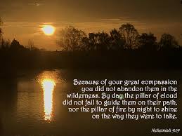 19 “Because of your great compassion you did not abandon them in the wilderness. By day the pillar of cloud did not fail to guide them on their path, nor the pillar of fire by night to shine on the way they were to take. 20 You gave your good Spirit to instruct them. You did not withhold your manna from their mouths, and you gave them water for their thirst. 21 For forty years you sustained them in the wilderness; they lacked nothing, their clothes did not wear out nor did their feet become swollen.