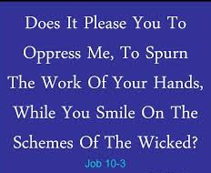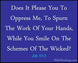 “I loathe my very life; therefore I will give free rein to my complaint and speak out in the bitterness of my soul. 2 I say to God: Do not declare me guilty, but tell me what charges you have against me. 3 Does it please you to oppress me, to spurn the work of your hands, while you smile on the plans of the wicked? 4 Do you have eyes of flesh? Do you see as a mortal sees? 5 Are your days like those of a mortal or your years like those of a strong man, 6 that you must search out my faults and probe after my sin— 7 though you know that I am not guilty and that no one can rescue me from your hand?