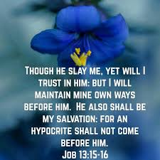 Bildad is coming down hard on Job for a second time with even more urgency in his words as he seeks to change Job’s mind with his judgements. Again, Job’s comeback uses a three-letter word that changes everything—yet! Job’s love for God is unchanging. Job’s hope and trust is in God alone. “Yet, will I trust Him” was said adamantly to his friends earlier in their discussions over his sins. With the heat turned up a notch by Bildad, Job now proclaims with confidence to his friend and anyone else in earshot;