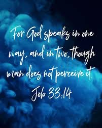 12 “But I tell you, in this you are not right, for God is greater than any mortal. 13 Why do you complain to him that he responds to no one’s words? 14 For God does speak—now one way, now another— though no one perceives it. 15 In a dream, in a vision of the night, when deep sleep falls on people as they slumber in their beds, 16 he may speak in their ears and terrify them with warnings, 17 to turn them from wrongdoing and keep them from pride, 18 to preserve them from the pit, their lives from perishing by the sword.