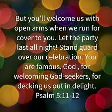 11-12 But you’ll welcome us with open arms when we run for cover to you. Let the party last all night! Stand guard over our celebration. You are famous, God, for welcoming God-seekers, for decking us out in delight.