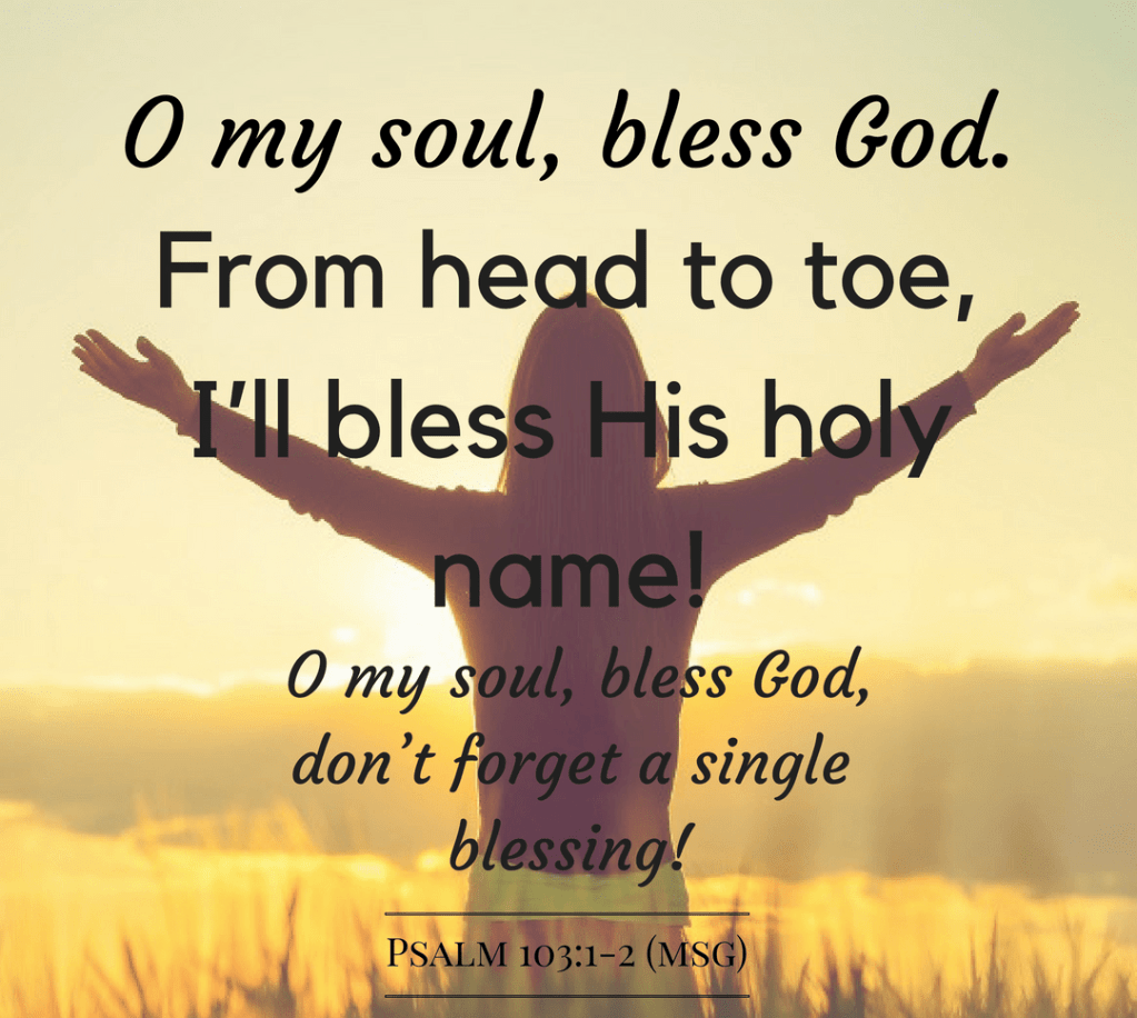 We have a new doctor of primary care in our lives. He is an interesting man as most doctors are. He actually takes time to hear you before diving in to “fix” you. He examines us “from head to toe” as he calls it because he says everything matters in the evaluation of our care. I think of this head-to-toe attitude, which is refreshing in the medical community, as I read, thank and praise God with “all that is in me” while considering our psalm for today.