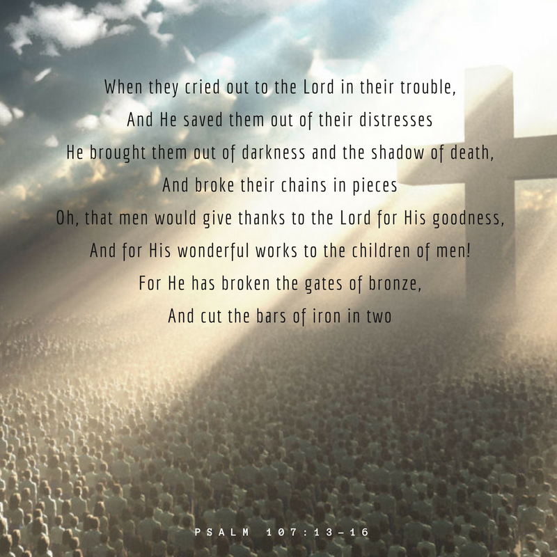 As we read the “repeat chorus” we see that each lyric of resolve begins with “THEN they called out to God”…and everything changed. God came in the “nick of time”, HIS time. He is waiting on us to let go so He can work His goodness. Let Him. As I read this psalm from long ago, this contemporary praise song is playing in the background of my mind…