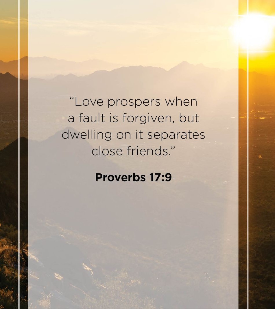 WISDOM: Proverb 17:9 “Love prospers when a fault is forgiven, but dwelling on it separates close friends.”