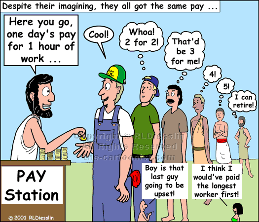 “For the Kingdom of Heaven is like the landowner who went out early one morning to hire workers for his vineyard. 2 He agreed to pay the normal daily wage and sent them out to work.
