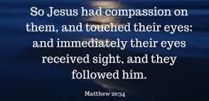 Jesus asks, “What do you want me to do for you?” Why would Jesus ask this question when it seems obvious to us and to them what the blind men needed most? Maybe Jesus wanted to them to “see” what was the most important to them—their faith in Him. What do you want most from Me? “We want to see!” What Jesus could “see” was their hearts. Jesus healed their sight instantly. But that’s not all. They rose from the dirt of begging to following their Healer. The now sighted men could have gone back to their former work, family and friends and way of life. But they chose to follow the Son of David who showed mercy on the road that day that changed their lives forever.
