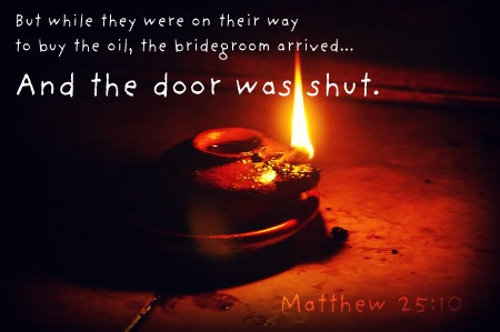 10 “But while they were gone to buy oil, the bridegroom came. Then those who were ready went in with him to the marriage feast, and the door was locked. 11 Later, when the other five bridesmaids returned, they stood outside, calling, ‘Lord! Lord! Open the door for us!’