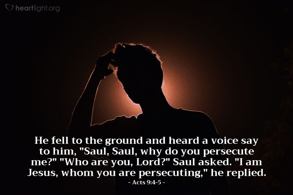 Saul, this blood thirsty terrorist of all new believers in Jesus, is stopped cold right in the middle of his mayhem. He meets The Master, Jesus Christ. Jesus speaks directly to Saul, “Why do you persecute Me?” This question alone brings new perspective to Saul’s thinking. I’m reminded of Jesus’ words to his disciples, “Whatever you did to the least of these, you did for me…” (Matthew 25:40) in the parable of the sheep and goats. Direct correlation?