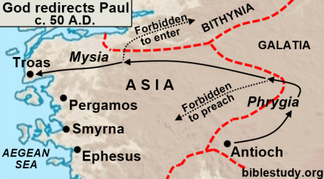 6-8 They went to Phrygia, and then on through the region of Galatia. Their plan was to turn west into Asia province, but the Holy Spirit blocked that route. So they went to Mysia and tried to go north to Bithynia, but the Spirit of Jesus wouldn’t let them go there either. Proceeding on through Mysia, they went down to the seaport Troas.