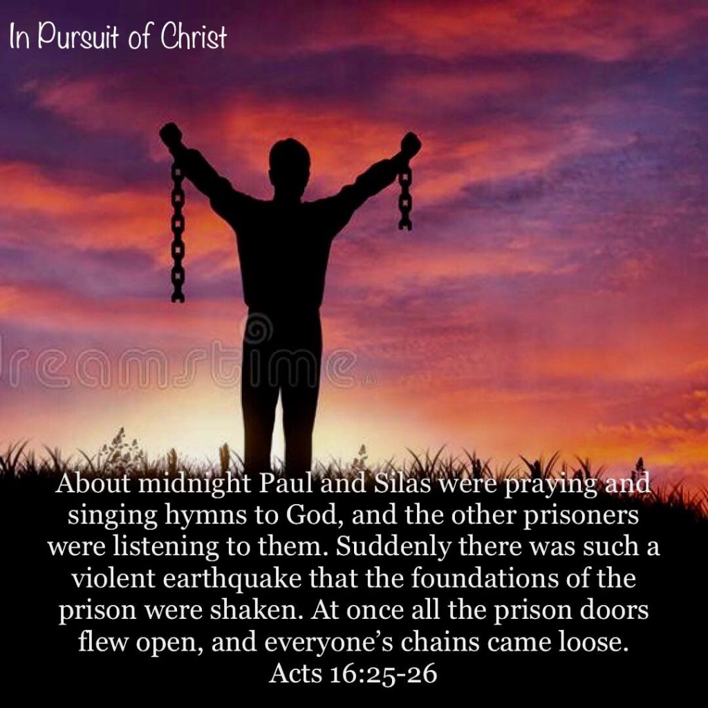 25-26 Along about midnight, Paul and Silas were at prayer and singing a robust hymn to God. The other prisoners couldn’t believe their ears. Then, without warning, a huge earthquake! The jailhouse tottered, every door flew open, all the prisoners were loose.