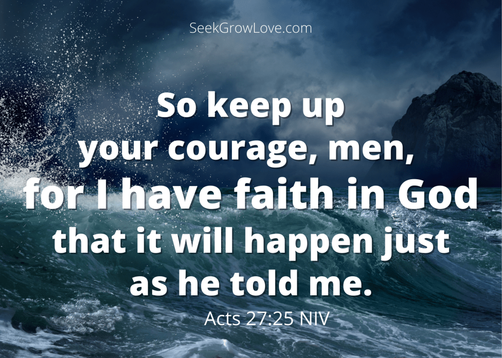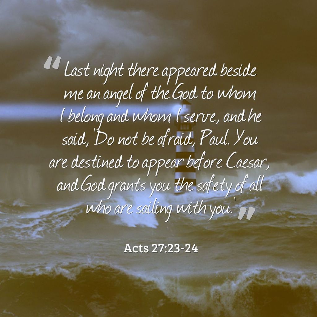 23-26 “Last night God’s angel stood at my side, an angel of this God I serve, saying to me, ‘Don’t give up, Paul. You’re going to stand before Caesar yet—and everyone sailing with you is also going to make it.’ So, dear friends, take heart. I believe God will do exactly what he told me. But we’re going to shipwreck on some island or other.”
