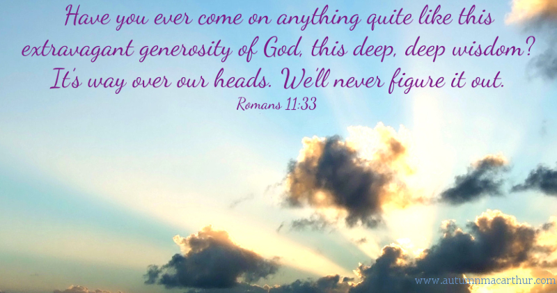 33-36 Have you ever come on anything quite like this extravagant generosity of God, this deep, deep wisdom? It’s way over our heads. We’ll never figure it out.