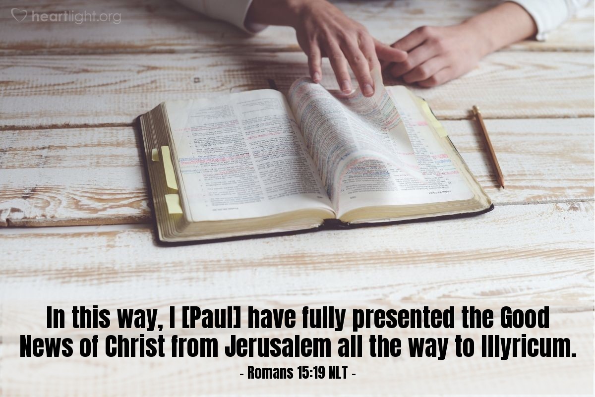 17-21 Looking back over what has been accomplished and what I have observed, I must say I am most pleased—in the context of Jesus, I’d even say proud, but only in that context. I have no interest in giving you a chatty account of my adventures, only the wondrously powerful and transformingly present words and deeds of Christ in me that triggered a believing response among the outsiders. In such ways I have trailblazed a preaching of the Message of Jesus all the way from Jerusalem far into northwestern Greece. This has all been pioneer work, bringing the Message only into those places where Jesus was not yet known and worshiped. My text has been,