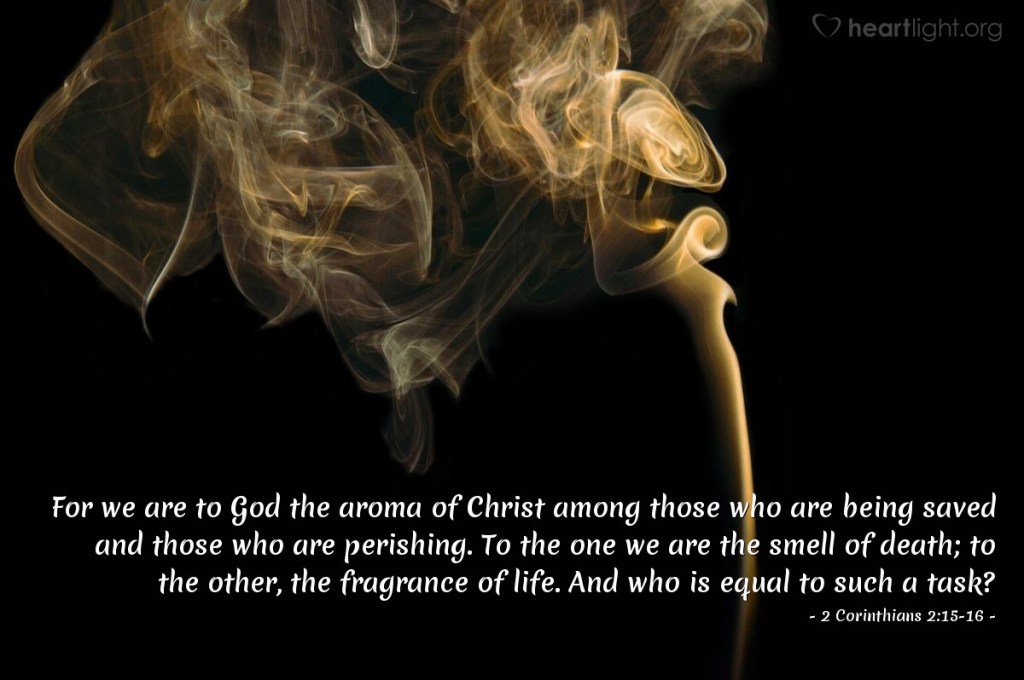 Using this image of the incense, Paul pictured the Christian ministry. He saw believers as incense, giving forth the fragrance of Jesus Christ in their lives and labors. To God, believers are the very fragrance of Jesus Christ. To other believers, we are the fragrance of life; but to unbelievers, we are the fragrance of death. In other words, the Christian life and ministry are matters of life and death. The way we live and work can mean life or death to a lost world around us.