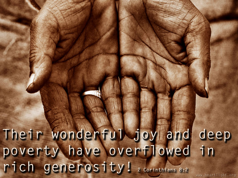 1-4 Now, friends, I want to report on the surprising and generous ways in which God is working in the churches in Macedonia province. Fierce troubles came down on the people of those churches, pushing them to the very limit. The trial exposed their true colors: They were incredibly happy, though desperately poor. The pressure triggered something totally unexpected: an outpouring of pure and generous gifts. I was there and saw it for myself. They gave offerings of whatever they could—far more than they could afford!—pleading for the privilege of helping out in the relief of poor Christians.