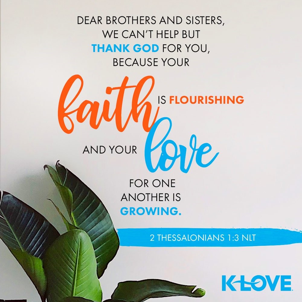 3-4 You need to know, friends, that thanking God over and over for you is not only a pleasure; it’s a must. We have to do it. Your faith is growing phenomenally; your love for each other is developing wonderfully. Why, it’s only right that we give thanks. We’re so proud of you; you’re so steady and determined in your faith despite all the hard times that have broadsided you. We tell everyone we meet in the churches all about you.