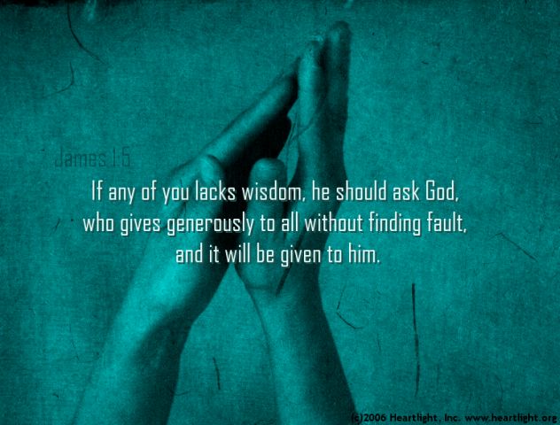 As we read the book of James together, may we first fall to our knees and ask God for wisdom. Wisdom is “skills for living” as defined by the world. God’s wisdom goes much deeper, higher and wider; for His knowledge and thinking is far above what anyone on earth can think or imagine. Ask God for wisdom. We will begin to see more clearly what He sees from His perspective as we daily seek Him.