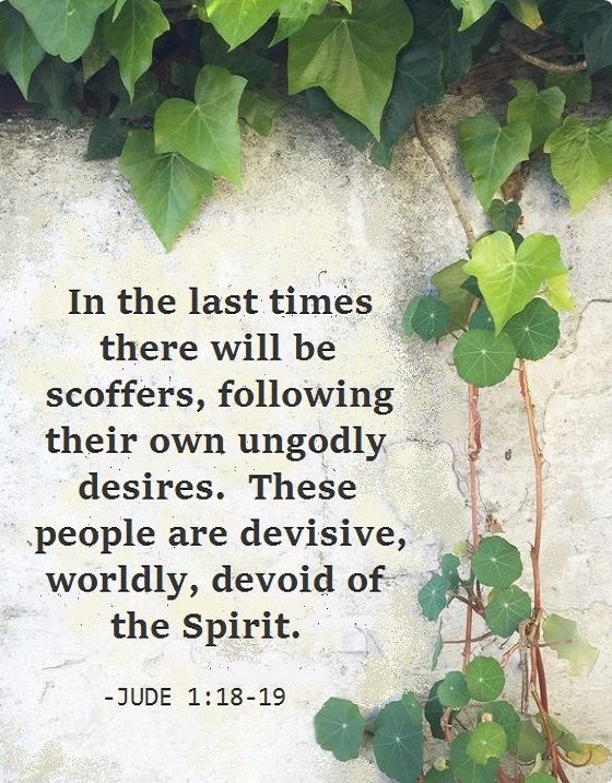 17-19 But remember, dear friends, that the apostles of our Master, Jesus Christ, told us this would happen: “In the last days there will be people who don’t take these things seriously anymore. They’ll treat them like a joke, and make a religion of their own whims and lusts.” These are the ones who split churches, thinking only of themselves. There’s nothing to them, no sign of the Spirit!