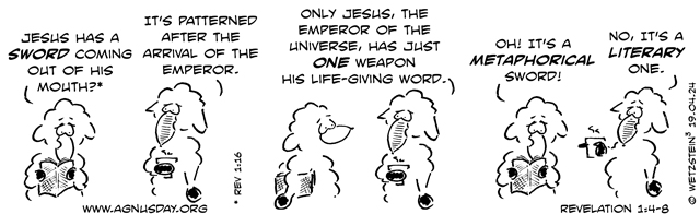 4-7 I, John, am writing this to the seven churches in Asia province: All the best to you from The God Who Is, The God Who Was, and The God About to Arrive, and from the Seven Spirits assembled before his throne, and from Jesus Christ—Loyal Witness, Firstborn from the dead, Ruler of all earthly kings.