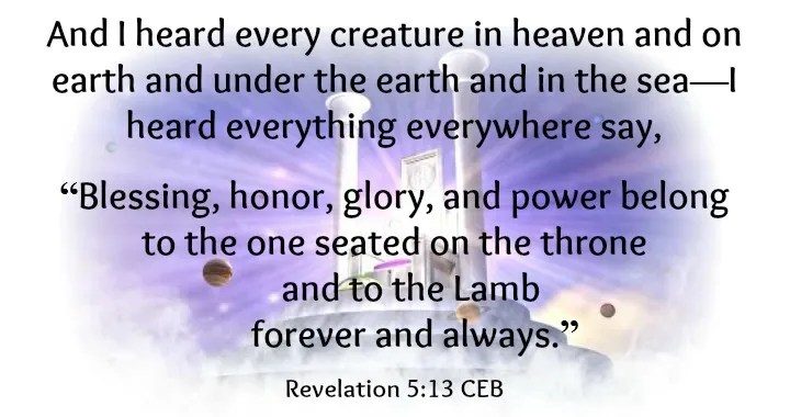 Then I heard every creature in Heaven and earth, in underworld and sea, join in, all voices in all places, singing: