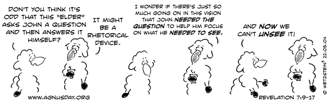 13-14 Just then one of the Elders addressed me: “Who are these dressed in white robes, and where did they come from?” Taken aback, I said, “O Sir, I have no idea—but you must know.”