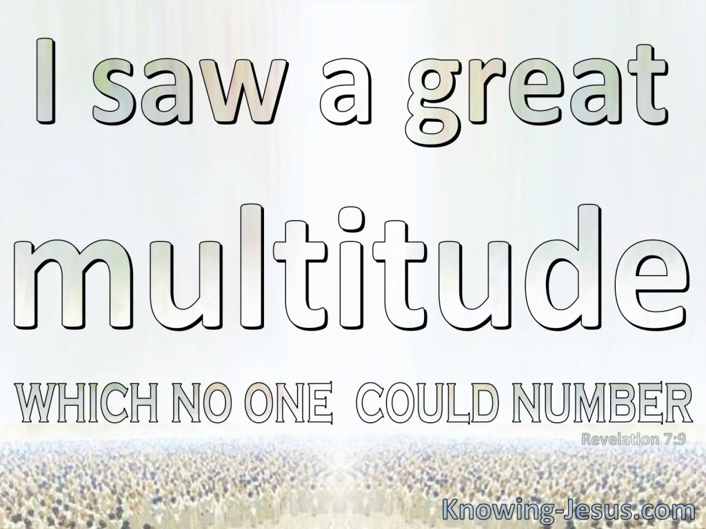 9-12 I looked again. I saw a huge crowd, too huge to count. Everyone was there—all nations and tribes, all races and languages. And they were standing, dressed in white robes and waving palm branches, standing before the Throne and the Lamb and heartily singing:
