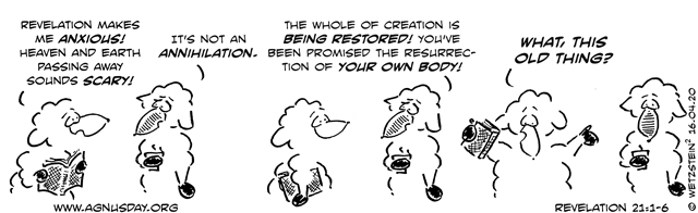 I saw Heaven and earth new-created. Gone the first Heaven, gone the first earth, gone the sea.