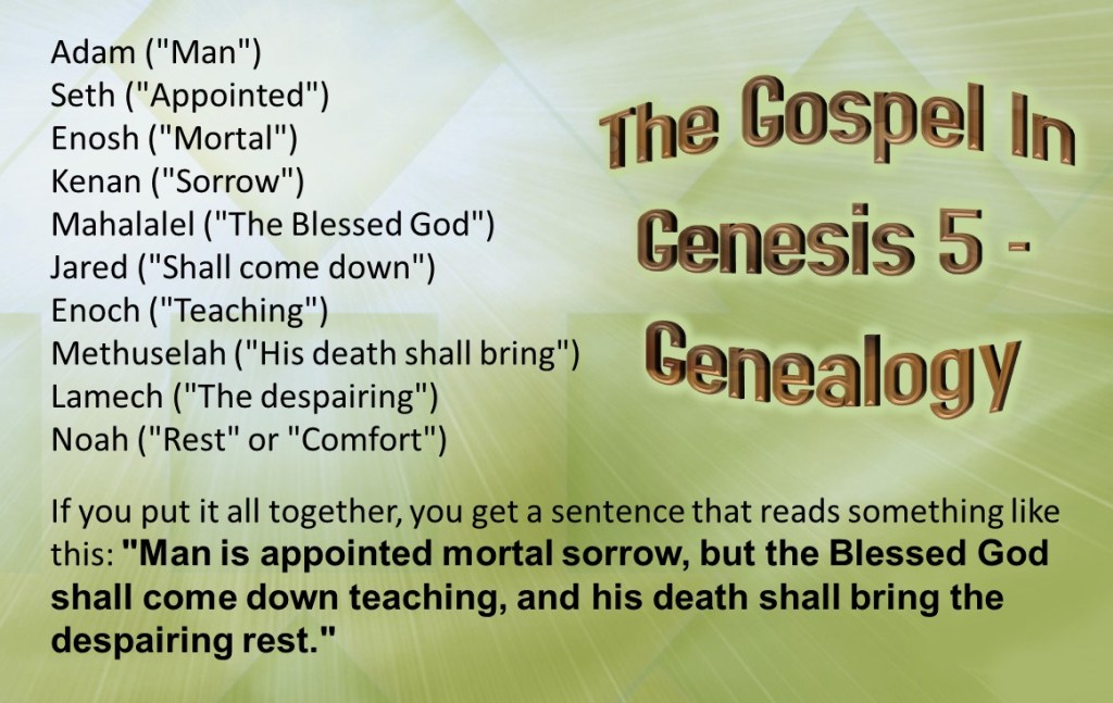 3-5 When Adam was 130 years old, he had a son who was just like him, his very spirit and image, and named him Seth. After the birth of Seth, Adam lived another 800 years, having more sons and daughters. Adam lived a total of 930 years. And he died.