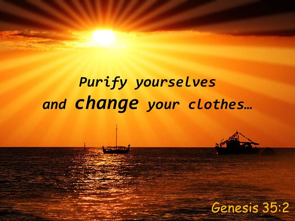 2-3 Jacob told his family and all those who lived with him, “Throw out all the alien gods which you have, take a good bath and put on clean clothes, we’re going to Bethel. I’m going to build an altar there to the God who answered me when I was in trouble and has stuck with me everywhere I’ve gone since.”
