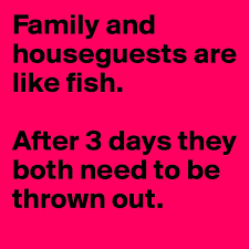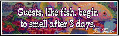 What is the saying? “After three days, fish and guests stink”. People say this comes from an old Proverb—but I don’t think it comes from our Bibles—it probably came from someone’s experience. Benjamin Franklin has been given credit for saying it, too. But we all know it’s true. If you have never had overnight guests, you don’t know what we’re saying here. I’ll explain. The idea is that fish start smelling if they’re left to sit around for a while, and that visitors, who keep prolonging a visit, can get to be really annoying, fast. An example of “Fish and visitors stink after three days” is when visitors come to stay overnight, but end up spending two weeks!