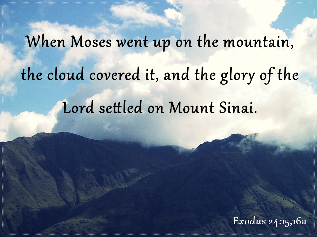 15-17 Then Moses climbed the mountain. The Cloud covered the mountain. The Glory of God settled over Mount Sinai. The Cloud covered it for six days. On the seventh day he called out of the Cloud to Moses. In the view of the Israelites below, the Glory of God looked like a raging fire at the top of the mountain.