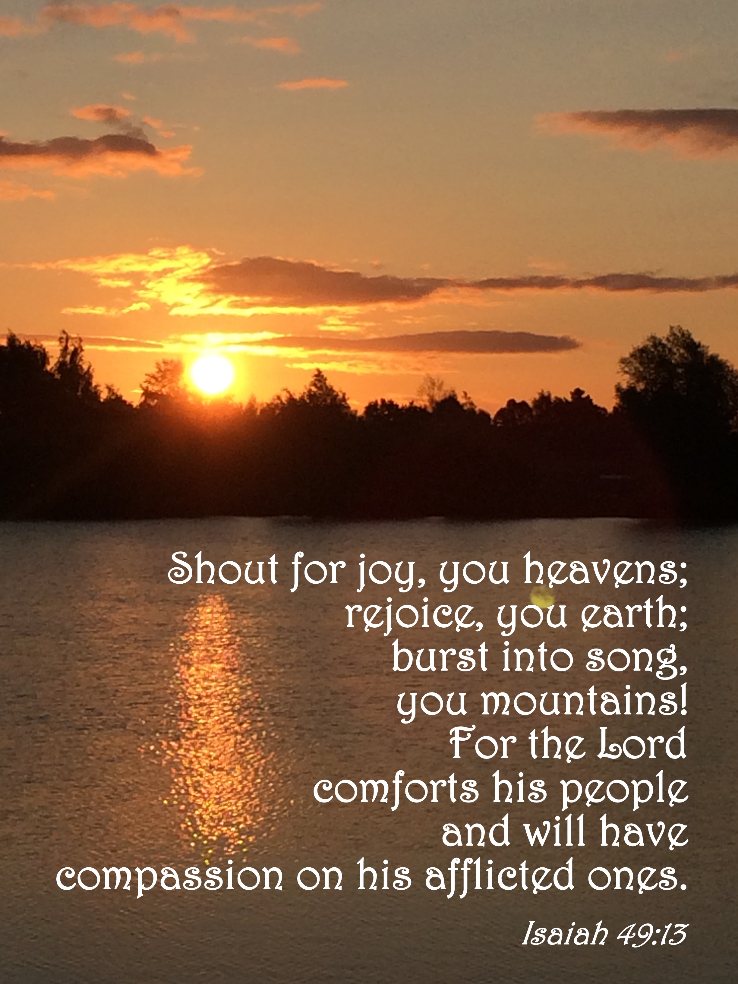 “Look up, look around, look well”and realize the depth of love God has for those who believe. God is for us, not against us. God sent Jesus, Light of the World, to pay for our sins so we can be set free from darkness to love Him back. God comforts those who struggle, are hurt, bruised, and broken by the dark world. God never, ever forgets us. Our names are engraved on His Hand! We are on His mind continually.