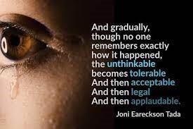 One of my favorite authors, Joni Eareckson Tada relates, “Though gradually, though no one remembers exactly how it happened, the unthinkable becomes tolerable. And then acceptable. And then legal. And then applaudable.”