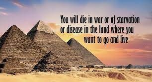 13-17 “But do not say, ‘We’re not staying around this place,’ refusing to obey the command of your God and saying instead, ‘No! We’re off to Egypt, where things are peaceful—no wars, no attacking armies, plenty of food. We’re going to live there.’ If what’s left of Judah is headed down that road, then listen to God’s Message. This is what God-of-the-Angel-Armies says: ‘If you have determined to go to Egypt and make that your home, then the very wars you fear will catch up with you in Egypt and the starvation you dread will track you down in Egypt. You’ll die there! Every last one of you who is determined to go to Egypt and make it your home will either be killed, starve, or get sick and die. No survivors, not one! No one will escape the doom that I’ll bring upon you.’