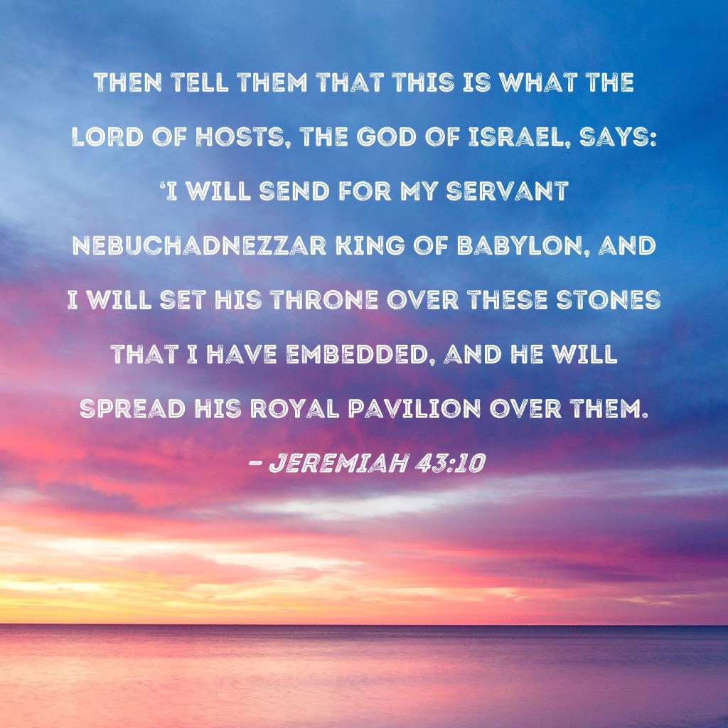 10-13 “Then address them: ‘This is what God-of-the-Angel-Armies says: Be on the lookout! I’m sending for and bringing Nebuchadnezzar the king of Babylon—my servant, mind you!—and he’ll set up his throne on these very stones that I’ve had buried here and he’ll spread out his canopy over them. He’ll come and absolutely smash Egypt, sending each to his assigned fate: death, exile, slaughter. He’ll burn down the temples of Egypt’s gods. He’ll either burn up the gods or haul them off as booty. Like a shepherd who picks lice from his robes, he’ll pick Egypt clean. And then he’ll walk away without a hand being laid on him. He’ll shatter the sacred obelisks at Egypt’s House of the Sun and make a huge bonfire of the temples of Egypt’s gods.’”