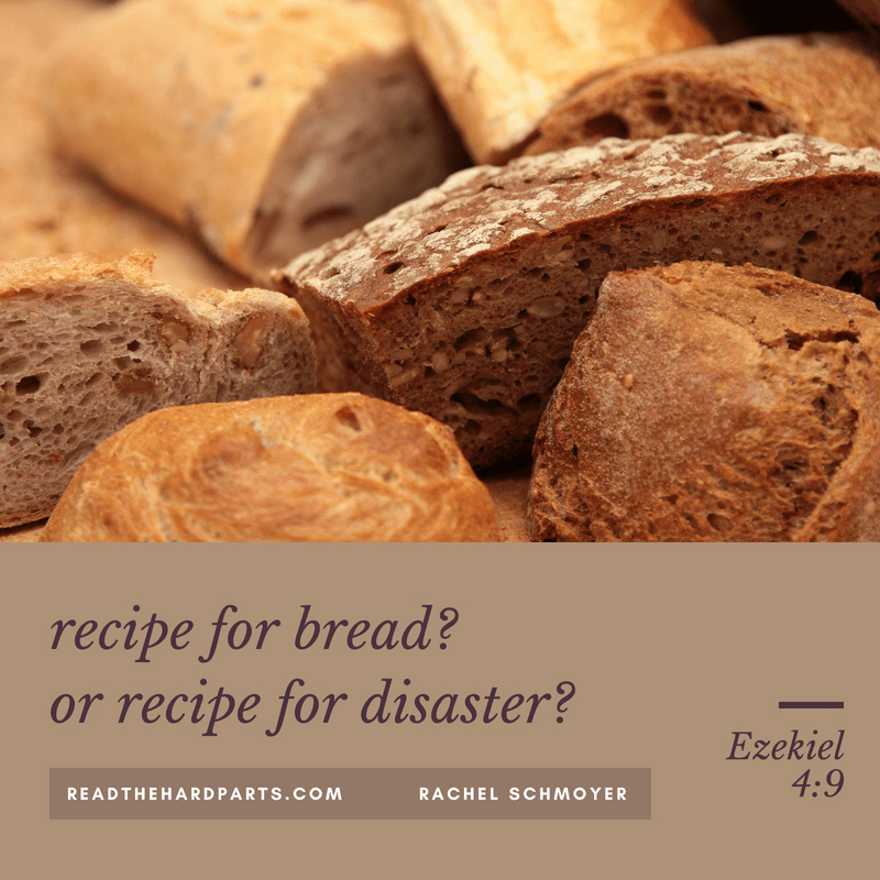 9-12 “Next I want you to take wheat and barley, beans and lentils, dried millet and spelt, and mix them in a bowl to make a flat bread. This is your food ration for the 390 days you lie on your side. Measure out about half a pound for each day and eat it on schedule. Also measure out your daily ration of about a pint of water and drink it on schedule. Eat the bread as you would a muffin. Bake the muffins out in the open where everyone can see you, using dried human dung for fuel.”