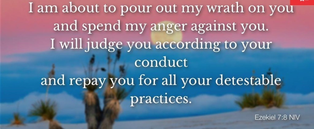 Ezekiel proclaims God’s judgement with Israel’s impending fate… “I’ll make you pay for the way you’ve lived: Your disgusting obscenities will boomerang on you, and you’ll realize that I am God.”