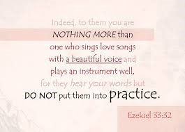 30-32 “As for you, son of man, you’ve become quite the talk of the town. Your people meet on street corners and in front of their houses and say, ‘Let’s go hear the latest news from God.’ They show up, as people tend to do, and sit in your company. They listen to you speak, but don’t do a thing you say. They flatter you with compliments, but all they care about is making money and getting ahead. To them you’re merely entertainment—a country singer of sad love songs, playing a guitar. They love to hear you talk, but nothing comes of it.