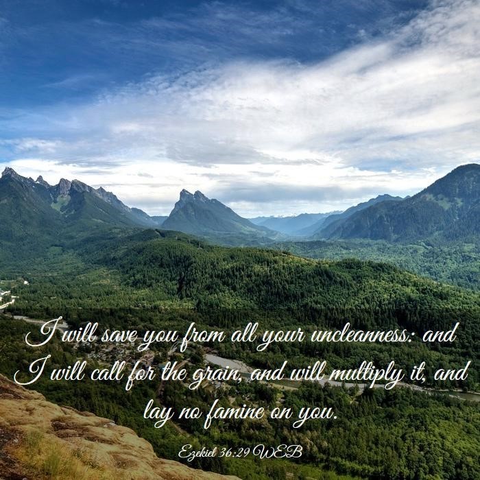 29-30 “‘I’ll pull you out of that stinking pollution. I’ll give personal orders to the wheat fields, telling them to grow bumper crops. I’ll send no more famines. I’ll make sure your fruit trees and field crops flourish. Other nations won’t be able to hold you in contempt again because of famine.