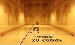 48-49 He led me to the porch of the Temple and measured the gateposts of the porch: eight and three-quarters feet high on both sides. The entrance to the gate complex was twenty-one feet wide and its connecting walls were four and a half feet thick. The vestibule itself was thirty-five feet wide and twenty-one feet deep. Ten steps led up to the porch. Columns flanked the gateposts.