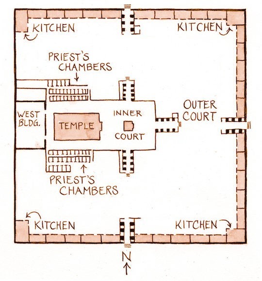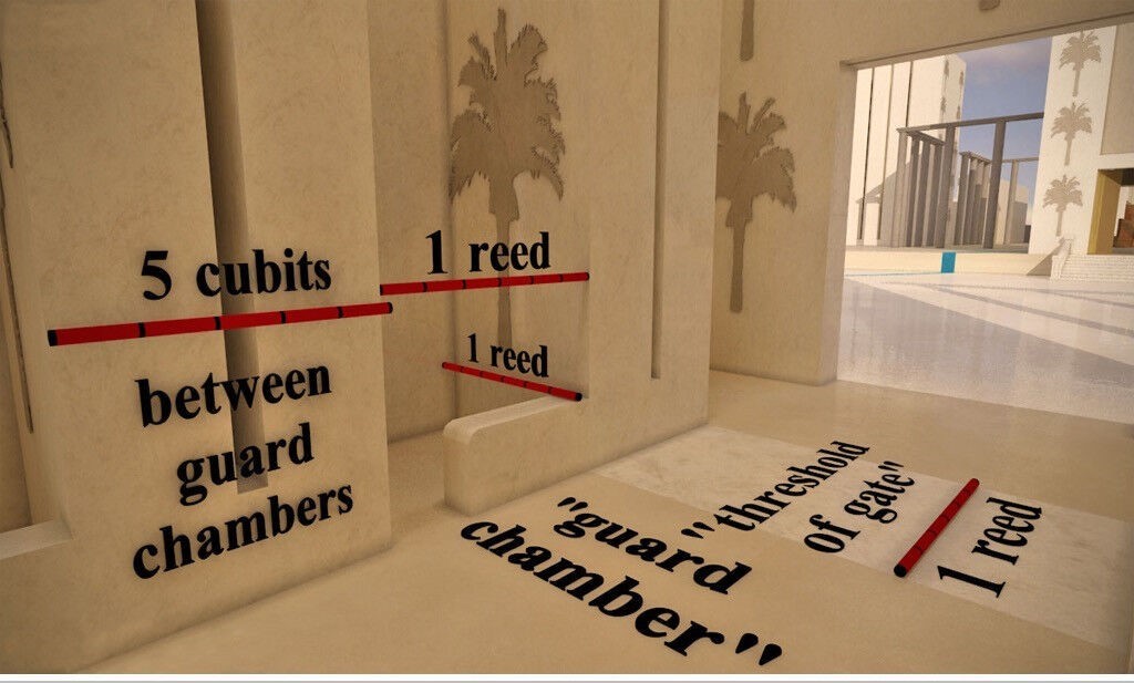 8-9 He measured the inside porch of the gate complex: twelve feet deep, flanked by pillars three feet thick. The porch opened onto the Temple courtyard.