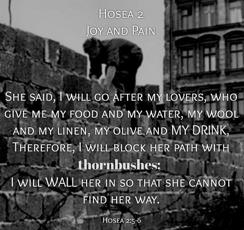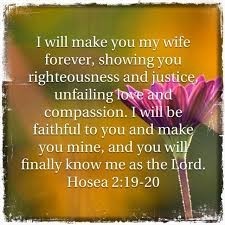 God told His prophets (not just Hosea) the way back to Him with a plan to renew and restore his relationship with His “bride”—God’s Chosen. The plan began by getting rid of all that stood between God and His people—namely the sin of worshiping other gods and selling their souls for perversion, all that is not God. But God’s love for His people never changed. He knew, as the parable indicates clearly, that His bride had worn herself out looking for love in all the wrong places. So, God stepped in. “Party time is over. I’m calling a halt to the whole business, her wild weekends and unholy holidays.”