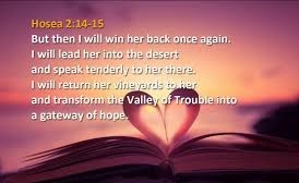 I’ll take her back to where our love began, says God and remind her of the love I have for her. I’ll show her the way back to Me. “I’ll turn Heartbreak Valley into Acres of Hope. She’ll respond like she did as a young girl, those days when she was fresh out of Egypt”. Our relationship will be restored.