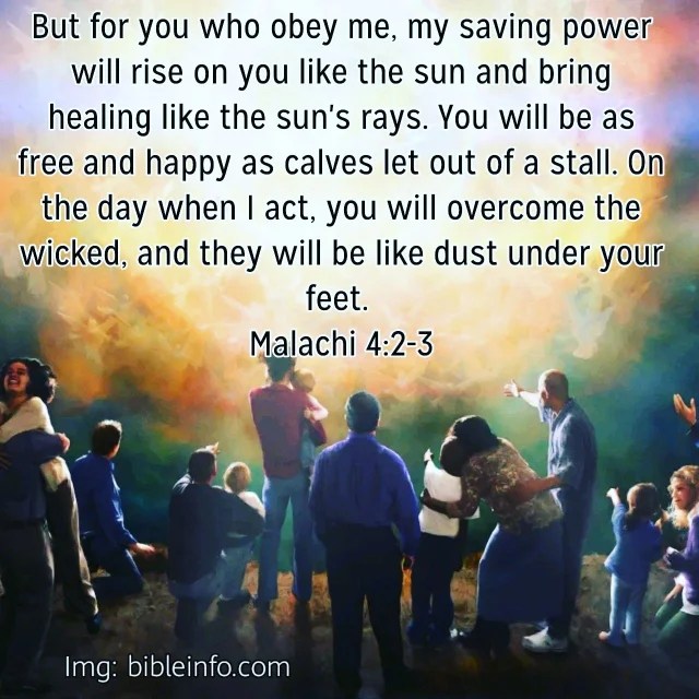 1-3 “Count on it: The day is coming, raging like a forest fire. All the arrogant people who do evil things will be burned up like stove wood, burned to a crisp, nothing left but scorched earth and ash—a black day. But for you, sunrise! The sun of righteousness will dawn on those who honor my name, healing radiating from its wings. You will be bursting with energy, like colts frisky and frolicking. And you’ll tromp on the wicked. They’ll be nothing but ashes under your feet on that Day.” God-of-the-Angel-Armies says so.