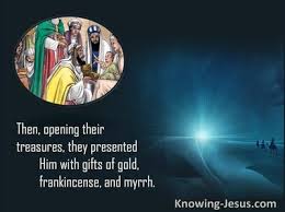 11 They entered the house and saw the child in the arms of Mary, his mother. Overcome, they kneeled and worshiped him. Then they opened their luggage and presented gifts: gold, frankincense, myrrh.