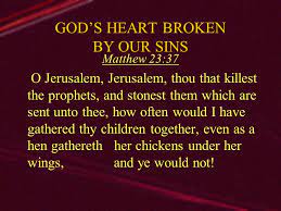 37-39 “Jerusalem! Jerusalem! Murderer of prophets! Killer of the ones who brought you God’s news! How often I’ve ached to embrace your children, the way a hen gathers her chicks under her wings, and you wouldn’t let me. And now you’re so desolate, nothing but a ghost town. What is there left to say? Only this: I’m out of here soon. The next time you see me you’ll say, ‘Oh, God has blessed him! He’s come, bringing God’s rule!’”